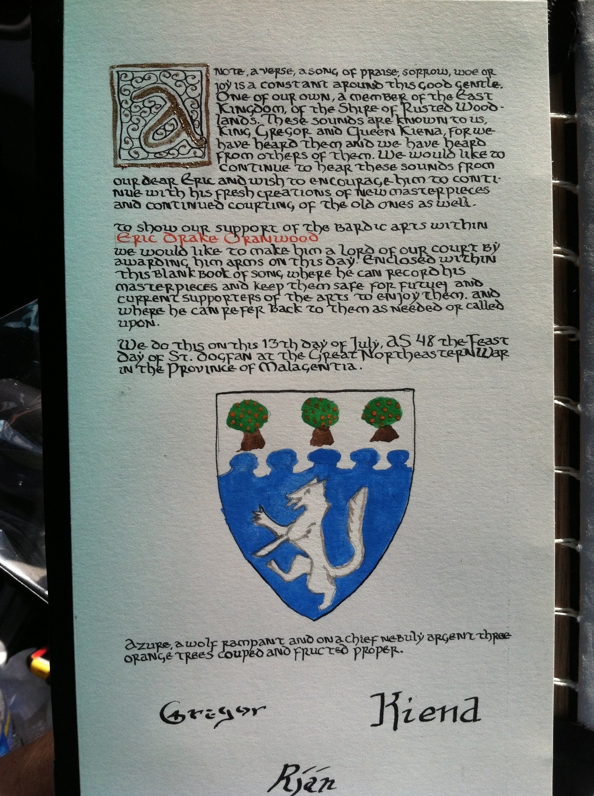 Oh. And Jess and I got our AoA’s. (Here’s mine. In a Bard Book. Yes it’s for the wrong date and event–coordinating mine and Jess’s scrolls for the same event took three tries and apparently lots of muddled communication. Don’t care. It’s in a Bard Book. Squee.)