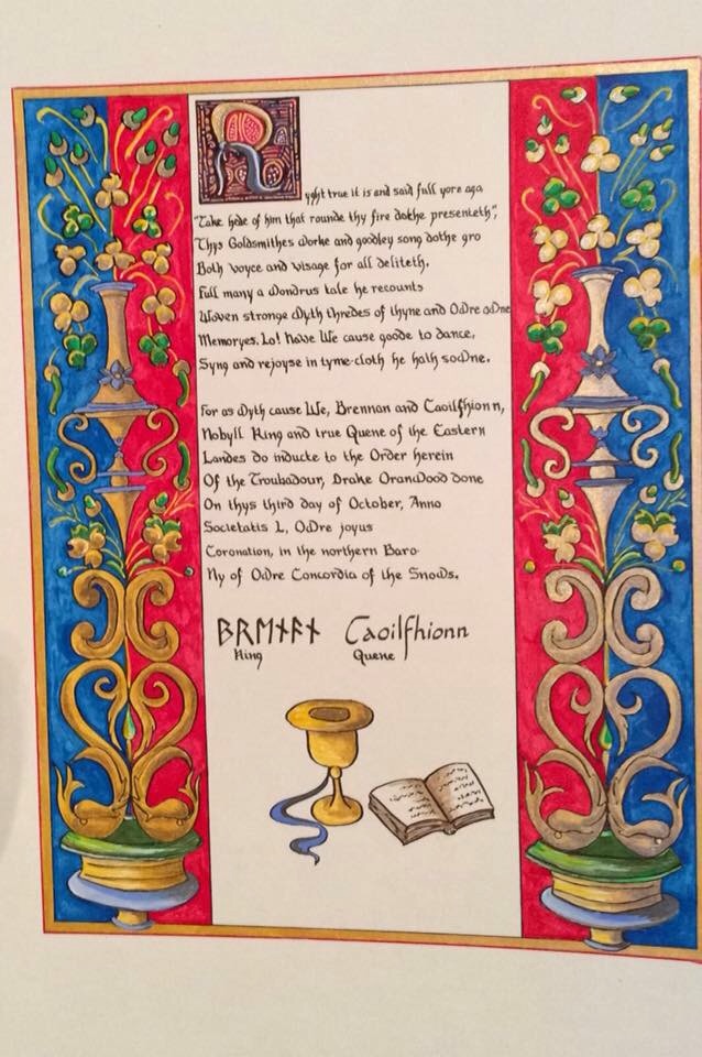 My friend Katrusha Skomorokh created my Troubadour scroll, and selected Olivia Baker to compose the words for it. I was particularly pleased that Olivia agreed to work on my scroll, as she has been an invaluable advisor and teacher to me of late: she was my vocal coach, and one of my small circle of critical advisors during the late production stages of Hidden Gold. It is a vibrant piece of work, and I’m deeply honored at the time and effort that went into it. (I should mention at this point that Katrusha did this work with a broken arm.)