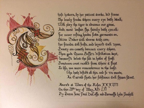 Another friend, Katrusha Skomorokh, was assigned the scroll. (Scribes generally have the option to compose the text or find a volunteer to do it, depending on what is called for.) I was very pleased when Katrusha asked me if I would write the text for Olivia, since (a) I had been wanting to try my hand at a scroll text for some time, (b) Olivia has been a tremendous inspiration in my efforts to expand my own Elizabethan persona, and (c) I had just recently asked for Katrusha’s help on a project (the Sing for the East cover art), and she had delivered in spades.