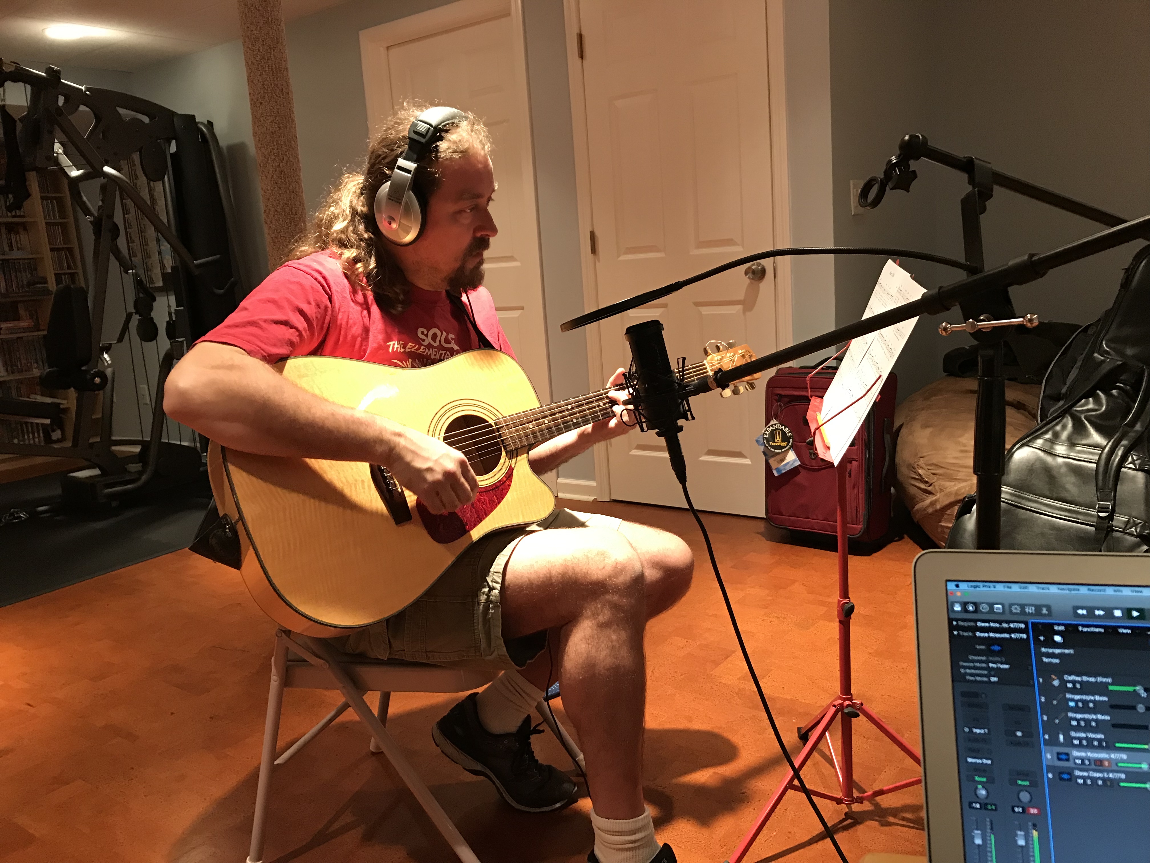 Today, I brought Dave in and gave him printouts of the sheet music for the chords, and had him record along. A lot of times we’ll do two different guitar tracks, the second of which has the capo on the guitar so that he’ll play higher up on the neck. That requires us to transpose the chords into the appropriate key for where the capo will be placed. It only takes a few minutes to do, but with the sheet music available in MuseScore, I could do it instantly and print out the new chords, speeding things up.