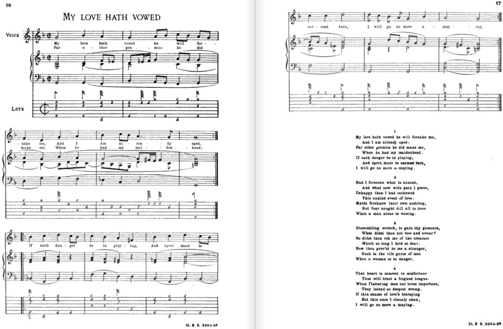 This week, our A&S journey returns to Campion, for a piece I have been looking forward to re-examining: “My love hath vowed”. This piece, and the way I was introduced to it, marked a turning point in my relationship with Elizabethan songs, as we’ll discuss in coming weeks, so I have saved it for the end of this particular Campion cycle. This is the first Elizabethan piece I encountered that tells a woman’s story from a woman’s perspective, something Campion did more than any of his contemporaries. While I can play and sing this piece with the original lyrics, this video of it, in a modern setting, was the one that made me fall in love with it (notwithstanding they omitted the fourth verse).